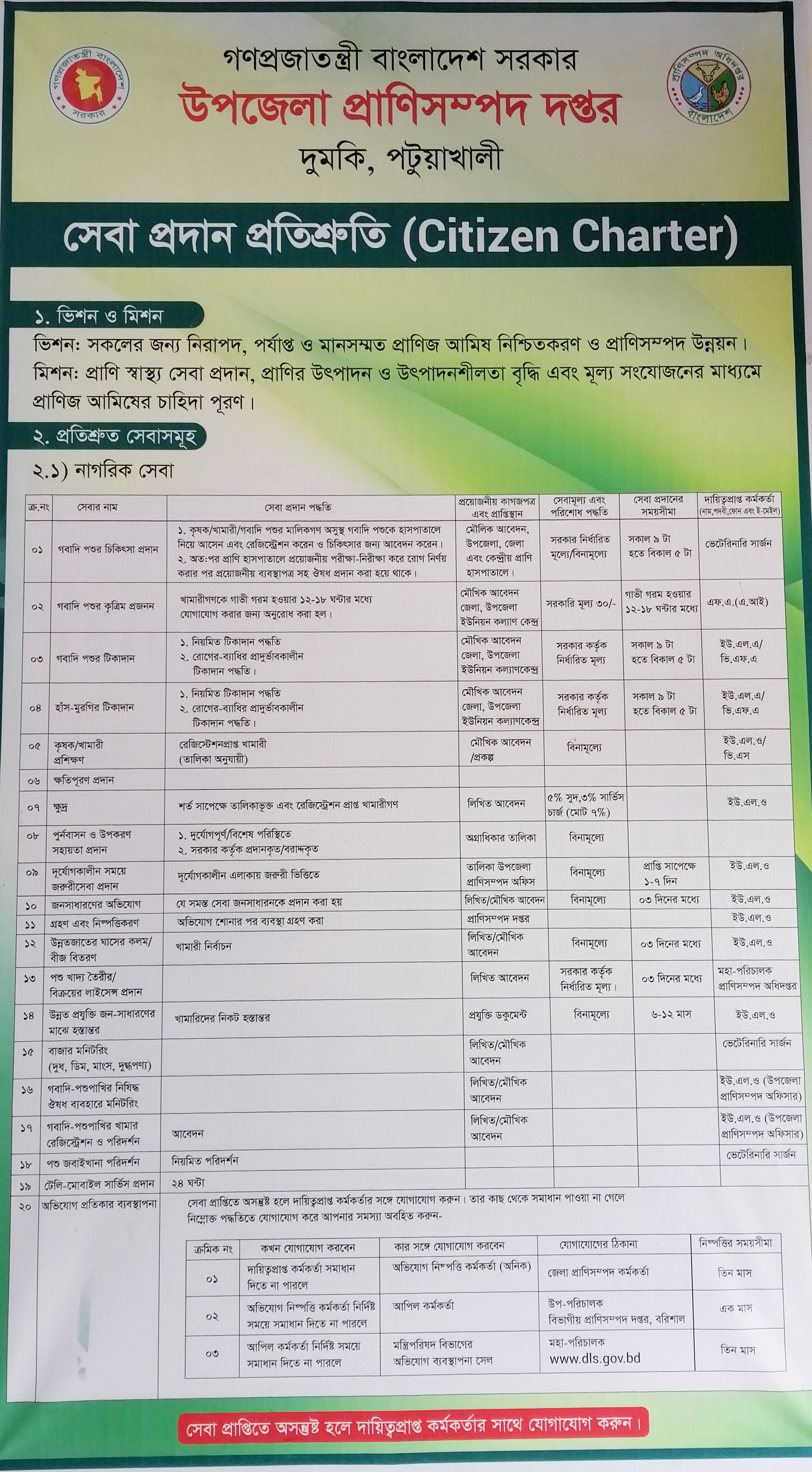| গবাদিপশুর চিকিৎসা প্রদান প্রদান | রোগ নির্ণয়, ঔষধ প্রদান ,শল্য চিকিৎসা প্রদান,পরামর্শ প্রদান। সেবার জন্য রোগ সমূহ- ‘ক’ শেণ্রী ফুট এন্ড মাউথ ডিজিজ(ক্ষুরারোগ),রিন্ডারপেষ্ট,ভেসিকুলার ষ্টোমাটাইটিস,পেষ্টিডেস পেটাইটিস ইন রুমিনেন্ট, গোট পকস, শীপ পক্স, নিউ ক্যাসল ডিজিজ (রাণীক্ষেত), এভিয়ান ইনফ্লুয়েঞ্জা। ‘খ’শ্রেণী রেবিস,এনথা্রক্স, বস্নাক কোয়ার্টার (বাদলা) হিমোরেজিক সেপটিসেমিয়া(গলাফুলা) ফাউল পক্স(মুরগীর বসনত),মারেক্স ডিজিজ,গামবোরো ডিজিজ,ডাক ভাইরাল এন্টারাইটি(ডাক প্লেগ), পোলোরাম ডিজিজ, ফাউল কলেরা, ব্রুসেলোসিস, টিউবারকোলোসিস, বোভাইন জেনিটাল ক্যামফাইলো ব্যা্টেরিওসিস. ভিব্রিওসিস, লেপ্টোস্পাইরোসিস, জোনস ডিজিজ,সোয়াইন ইরিসেফালাস ইনফে. এভিয়ান টিউবারকোলোসিস, কণ্টাজিয়াস প্লুরো নিউমোনিয়া বোভাইন ভাইরাল ডাইরিয়া, ম্যালিগনেন্ট ক্যাটারাল ফিভার, লাম্পি স্কীন ডিজিজ, ইনফেকসাস বোভাইন রাইনোট্রাকিয়াইটিন, বোভাইন ভাইরাল লিওকোসিস, ট্রিপেনোসোমিয়াসিস, ট্রাইকোমোনিয়াসিস,বেবেসিওসিস, এনাপ্লাজমোসিস, থাইলেরিওসিস, ওয়ার্বল ফ্লাই(হাইপোডারমা বোভিস এন্ড লিনেটাম), ডারমাটোমাইকোসিস, গ্ল্যান্ডার্স, আফ্রিকান হর্স সিকনেস, ইনফেসাস ইকোয়াইন এনসেফালোমায়েলাইটিস, ইপিজোটিক লিম্ফেনজাইটিস, ইকোয়াইন ইনফেকসাস এানমিয়া, জাপানিজ বি এনসেফালাইটিস, পাসচুরেলোসিস, কসটাজিয়াস ক্যাপরাইন প্লুরো নিউমোনিয়া, ভিবরিও ফিটাস, কিউ ফিভার, কনটাজিয়াস পাসচুলার ডার্মাটাইটিস, ব্লু টাং, মেইডি ভিস্না, এডিনোমেটোসিস, স্ক্র্যাপি, নোয়াইন ইরিসিপেলাস, ইনটেসটাইনাল সালমোনেলা ইনফেকসান,ভেসিকুলার এক্সানথিমা, ক্লাসিকেল সোয়াইন ফিভার। আফ্রি্কান সোয়াইন ফিভার, ওঢেজেসকিস ডিজিজ, এট্রোফিক গ্যাসট্রোএন্টারাইটিস, ক্যানাইন পারবোভাইরাস ইনফেকশান,ক্যানাইন হারপিস ভাইরাস ইনফেকশন, ফেলাইন ইনফেকশন এনিমিয়া, ফেলাইন লিউকেমিয়া ভাইরাস এন্ড রিলেটেড ডিজিজেস,ফেলাইন প্যান লিউকোপেনিয়া, ইনফেকসাস কেনাইন হেপাটাইটিস,ক্যানাইন ইনফ্লুয়েঞ্জা, ক্যানাইন এন্টারাইটিস, ক্যানাইন ডিস্টেম্পার,ফাউল টাইফয়েড, ফাউল গ্লেগ,এভিয়ান লিউকোসিস, ইনফেকসাস এভিয়ান এনসেফালোমাইলাইটিস,ইনফেকসাস ল্যারিনগো ট্রাকিয়াইটিস, এভিয়ান ইনফেকসাস ব্রংকাইটিস,মাইকোপ্লাজমোসিস, চিকেন এনিমিয়া ভাইরাল ইনফেকশন,ডাক ভাইরাল হেপাটাইটিস, নেকরোটিক এন্টারাইটিস, কলিব্যাসিলোসিস, গোজ ভাইরাল হেপাটাইটিস, লিমফয়েড লিউকোসিস, মাইলয়েড লিউকোসিস, ওমফ্যালাইটিস, প্যারাটাইফয়েড ইনফেকশন, ভাইরাল আরথ্রাইটিস, এনসেফালোমাইলাইটিস, এগ ড্রপসিনড্রম,এ্যাসপারজিলোসিস,ইনফেকসাস করাইজা,সোলেন হেড সিনড্রম, গ শ্রেণী ম্যালিয়ইডিস, পোলিফারেটিভ স্টোমাটাইটিস, ফুট রট,এভিয়ান ট